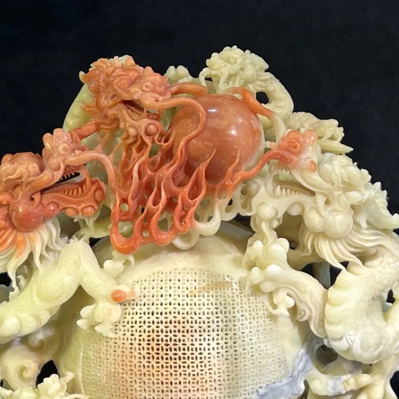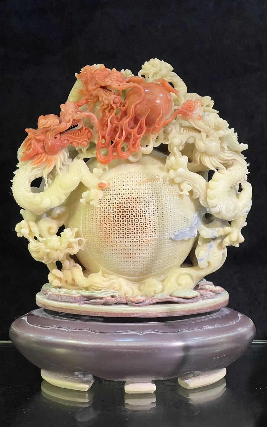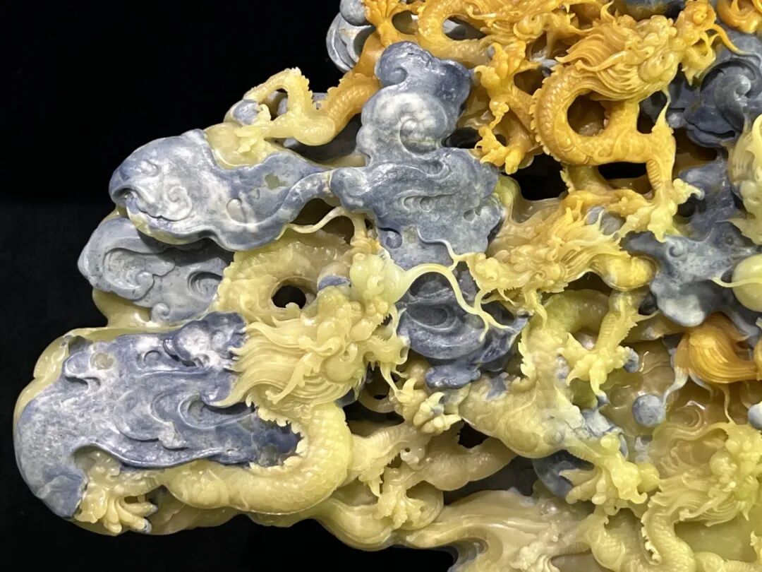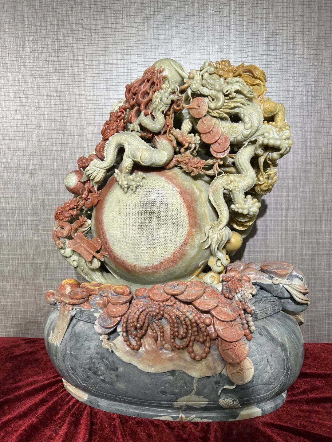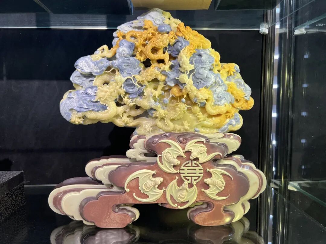 中国工艺美术大师张爱廷的大型青田石雕作品《神龙护宝》在展厅内十分引人注目。聚宝盆之上,神龙盘绕在宝珠周围,每一鳞片都被雕刻得栩栩如生;宝珠正面是细密的镂空方孔钱纹,透过中空内膛显示出背面“欢天喜地”四字。据介绍这一件高65厘米的巨作历经数年创作,处处表现出艺术家对细节的极致追求。这不仅仅是一件雕刻,更是对时间、生命的深刻沉思。