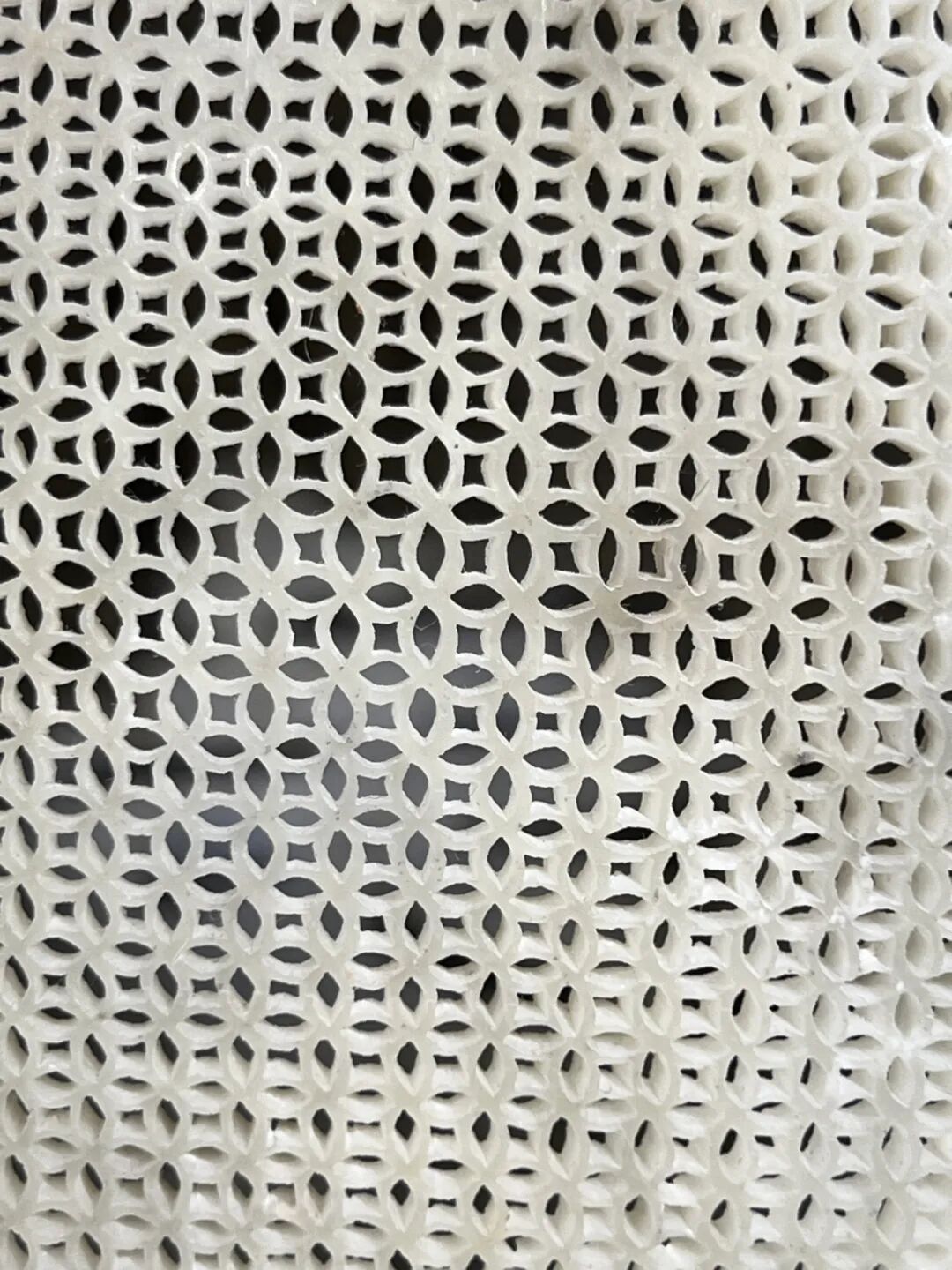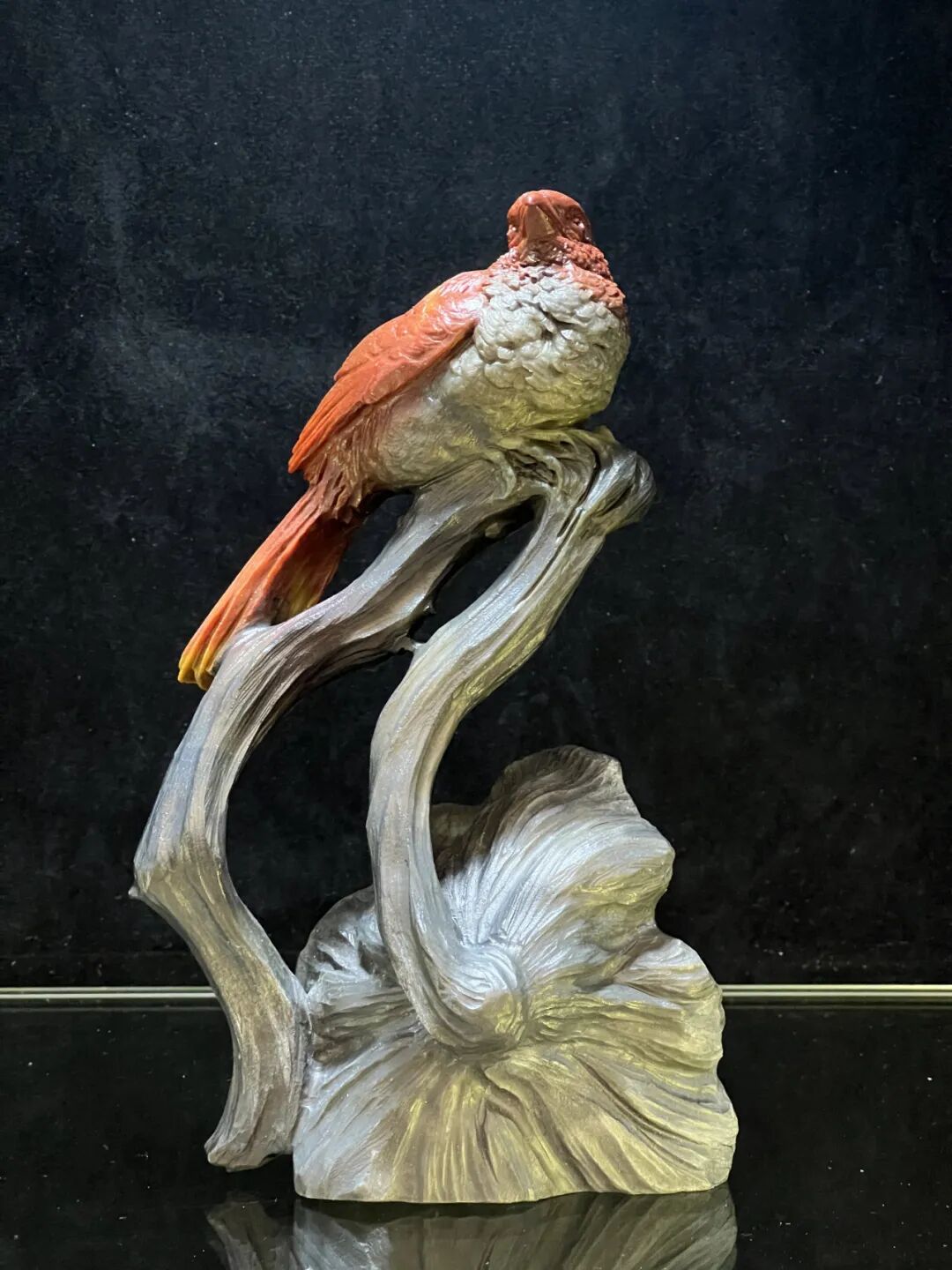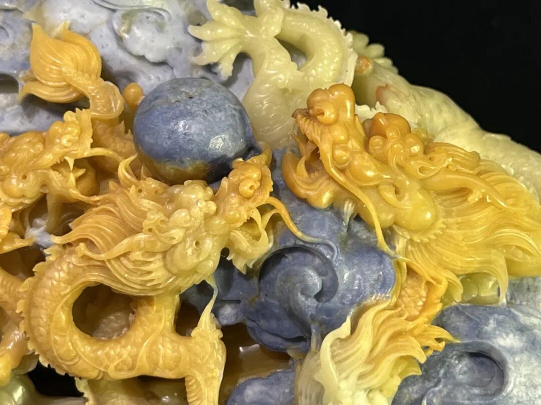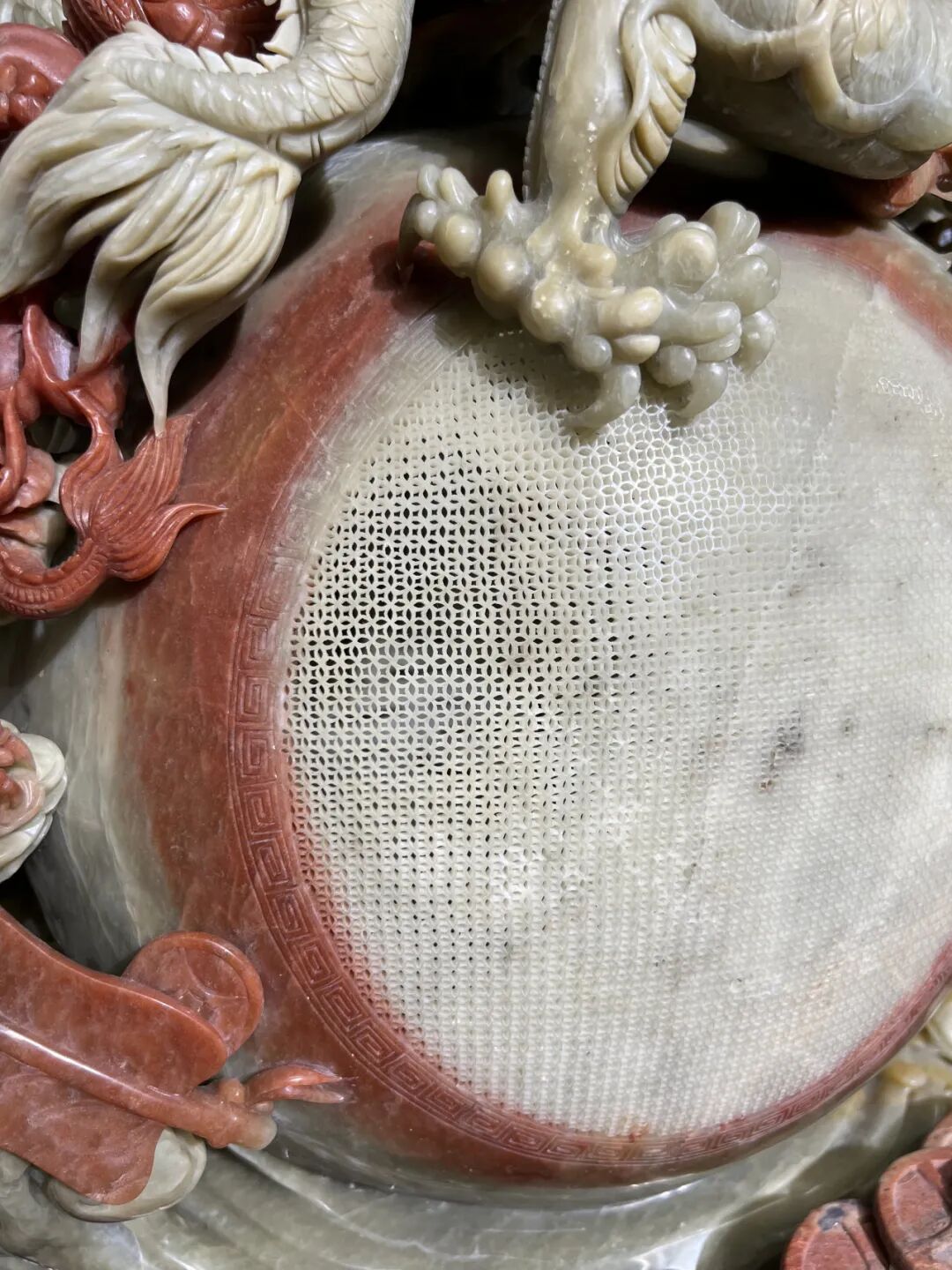 中国工艺美术大师张爱廷的大型青田石雕作品《神龙护宝》在展厅内十分引人注目。聚宝盆之上,神龙盘绕在宝珠周围,每一鳞片都被雕刻得栩栩如生;宝珠正面是细密的镂空方孔钱纹,透过中空内膛显示出背面“欢天喜地”四字。据介绍这一件高65厘米的巨作历经数年创作,处处表现出艺术家对细节的极致追求。这不仅仅是一件雕刻,更是对时间、生命的深刻沉思。