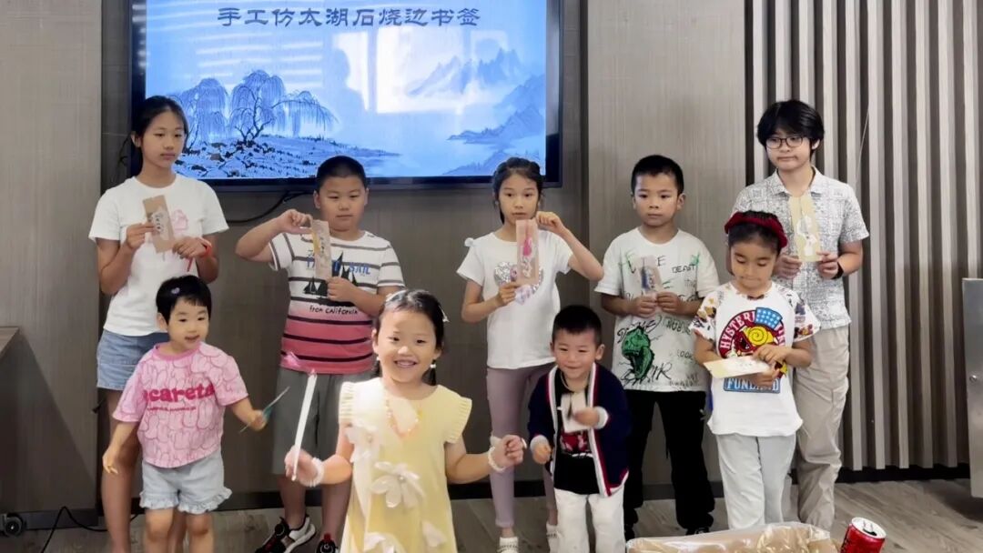 随后孩子们在老师的指导下,体验了一场手工仿太湖石烧边书签的制作活动。孩子们用线香沿着宣纸上的描边勾勒烧边,用他们的想象力创作出了形态各异的太湖石图案的书签,不仅锻炼了孩子们的动手能力,也培养了他们的创造力和审美能力。