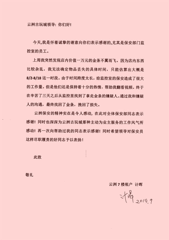 9月9日,云洲商厦办公室收到一封来自商户的感谢信。信中说他上周发现店内价值一万元的藏品不翼而飞,但无法确定丢失时间,只能估算出大概的8月2日至18日的时间段。由于时间跨度长,视频调阅工作量大,耗费了三天才从视频中找到拿走藏品的人,最终通过沟通,他拿回了藏品,挽回了损失。商户被云洲全心全意为商户服务的精神所感动,特来信表示感谢。