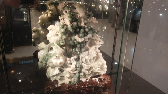 各式各样的翡翠摆件也十分引人入胜。翡翠摆件“安居乐业”以其精湛的雕工获得藏友的赞赏。作品中圆雕和镂雕技法的娴熟运用,翡翠上不同色料的巧妙利用,以及整个摆件诗意盎然的设计,十分令人称道。摆件中两朵菊花,一朵微绽,一朵盛开,每一朵花瓣都卷曲上翘。坚硬的翡翠化成柔软灵动的线条,流淌着浓浓的自然之美。菊花上和叶片下的两处黄色被巧妙的雕成两只扇着翅膀、贪恋花色的蝴蝶,而右下角的一处则被雕刻成几朵簇拥的小黄花。三只鹌鹑神态各异,憨态可人,整个作品表达了人们对田园风光和安居乐业的平静生活的向往。