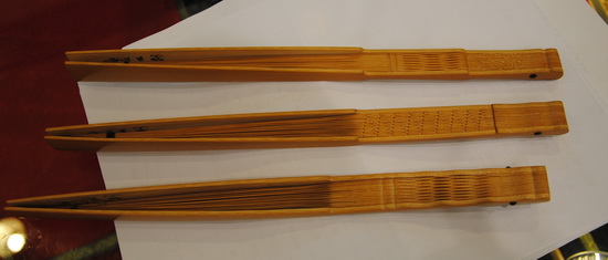 苏州美和工艺扇厂带来的湖南湘妃竹扇骨蜡底红花,分外漂亮;蛇纹木扇骨木材原产巴西,十分罕有,木色深褐,黑色斑点和类似蛇纹的花纹分布其上,也是异常赏心悦目。